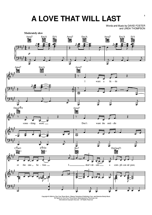 Digital Sheet Music for A Love That Will Last by Linda Thompson, Renee Olstead, David Foster scored for Piano/Vocal/Chords; id:379550