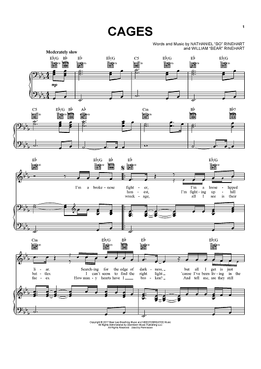 Digital Sheet Music for Cages by Nathaniel "Bo" Rinehart, William "Bear" Rinehart, NEEDTOBREATHE scored for Piano/Vocal/Chords; id:465564