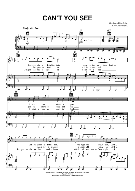 Digital Sheet Music for Can't You See by Toy Caldwell, The Marshall Tucker Band scored for Piano/Vocal/Chords; id:367779