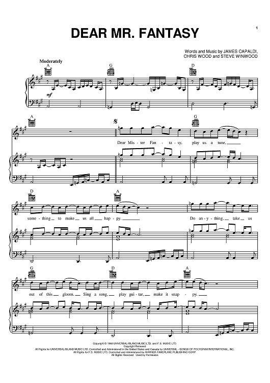 Digital Sheet Music for Dear Mr. Fantasy by Traffic, Steve Winwood, Chris Wood, James Capaldi scored for Piano/Vocal/Chords; id:388801