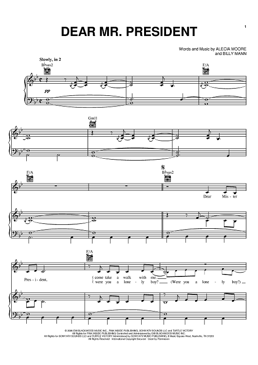 Digital Sheet Music for Dear Mr. President by Billy Mann, Pink scored for Piano/Vocal/Chords; id:394163