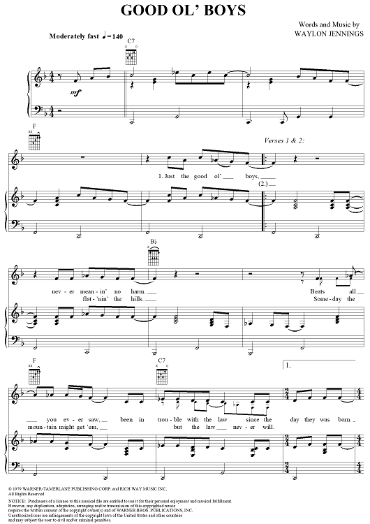 "Good Ol' Boys" Sheet Music by Waylon Arnold Jennings
