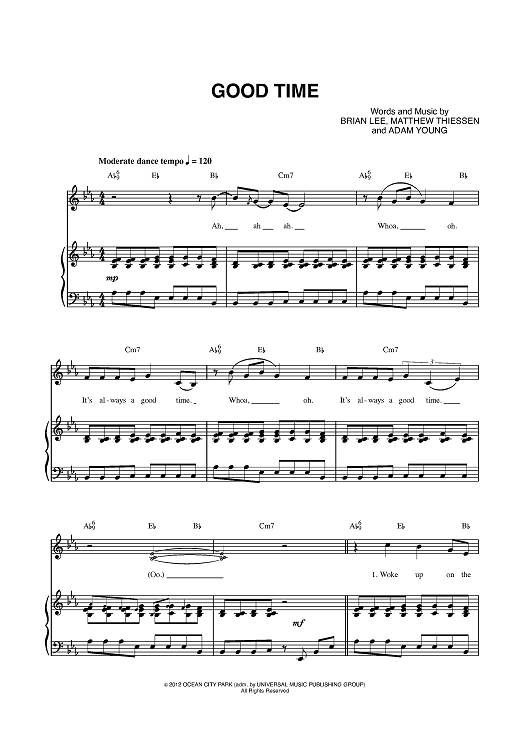 Digital Sheet Music for Good Time by Matt Thiessen, Owl City, Adam Young, Brian Lee, Carly Rae Jepsen scored for Piano/Vocal/Chords; id:432869
