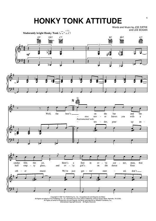 Digital Sheet Music for Honky Tonk Attitude by Joe Diffie, Lee Bogan scored for Piano/Vocal/Chords; id:369871