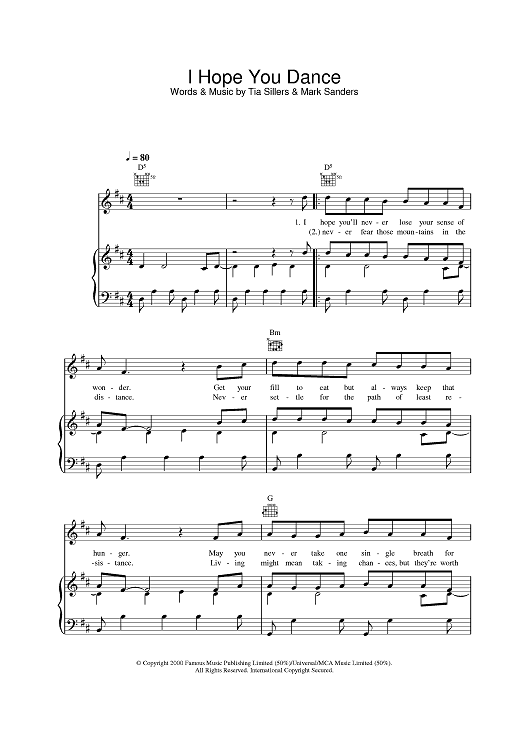 Digital Sheet Music for I Hope You Dance by Tia Sillers, Mark Sanders, Ronan Keating, Lee Ann Womack scored for Piano/Vocal/Chords; id:381288