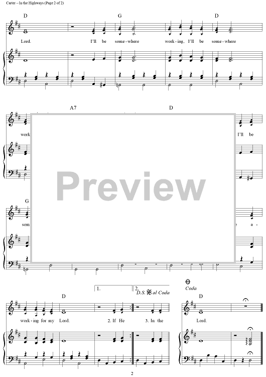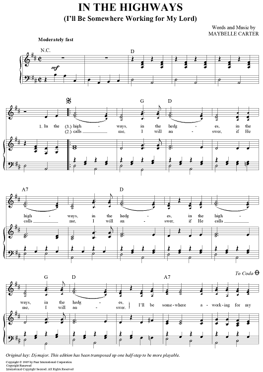 Digital Sheet Music for In The Highways (I'll Be Somewhere Working For My Lord) by Maybelle Carter scored for Piano/Vocal/Chords; id:367307