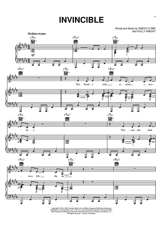 Digital Sheet Music for Invincible by Simon Climie, Holly Knight, Pat Benatar scored for Piano/Vocal/Chords; id:388482