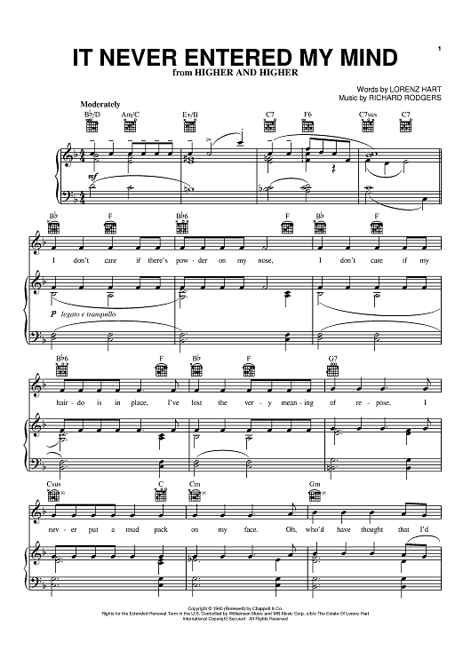 Digital Sheet Music for It Never Entered My Mind by Richard Rodgers, Lorenz Hart, Peggy Lee, Rosemary Clooney, Jane Monheit scored for Piano/Vocal/Chords; id:374067