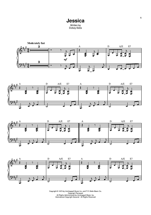 Digital Sheet Music for Jessica by Dickey Betts, The Allman Brothers Band scored for Piano/Vocal/Chords; id:398578