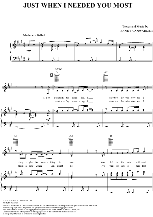 "Just When I Needed You Most" Sheet Music by Randy Van Warmer