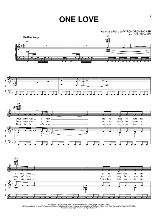 Digital Sheet Music for One Love by Pat Benatar, Neil Giraldo, Myron Grombacher scored for Piano/Vocal/Chords; id:388471