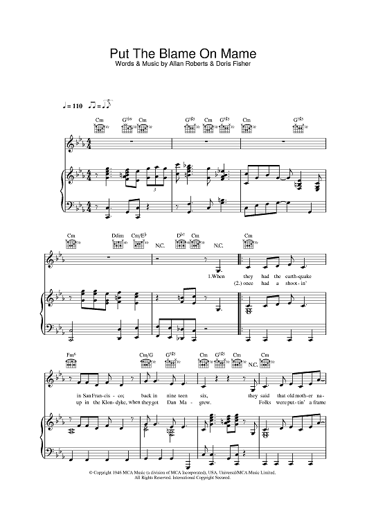 Digital Sheet Music for Put The Blame On Mame by Allan Roberts, Doris Fisher, Rita Hayworth scored for Piano/Vocal/Chords; id:387564