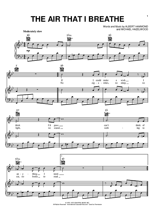 Digital Sheet Music for The Air That I Breathe by Albert Hammond, Mike Hazlewood, The Hollies, K.D. Lang scored for Piano/Vocal/Chords; id:395403