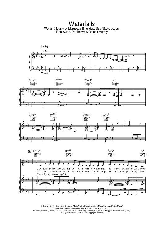 Digital Sheet Music for Waterfalls by TLC, Marqueze Etheridge, Pat Brown, Left Eye, Rico Wade, Ramon Murray scored for Piano/Vocal/Chords; id:377252
