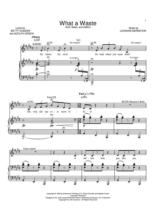 Digital Sheet Music for What A Waste by Leonard Bernstein, Betty Comden, Adolph Green scored for Piano/Vocal/Chords; id:373902