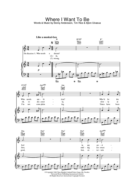 Digital Sheet Music for Where I Want To Be by Tim Rice, Benny Andersson, Bjorn Ulvaeus scored for Piano/Vocal/Chords; id:390328