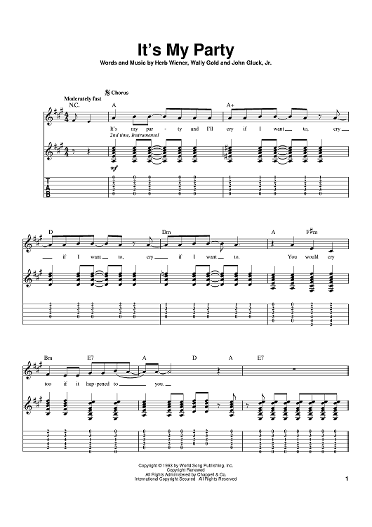 Digital Sheet Music for It's My Party by Lesley Gore, Herb Wiener, Wally Gold, John Gluck Jr. scored for Guitar Tab; id:397584