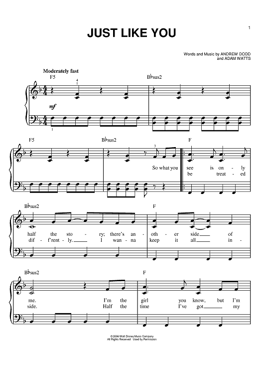 Digital Sheet Music for Just Like You by Hannah Montana, Adam Watts, Andy Dodd scored for Easy Piano; id:402746