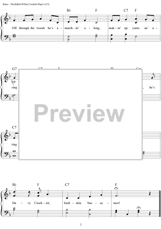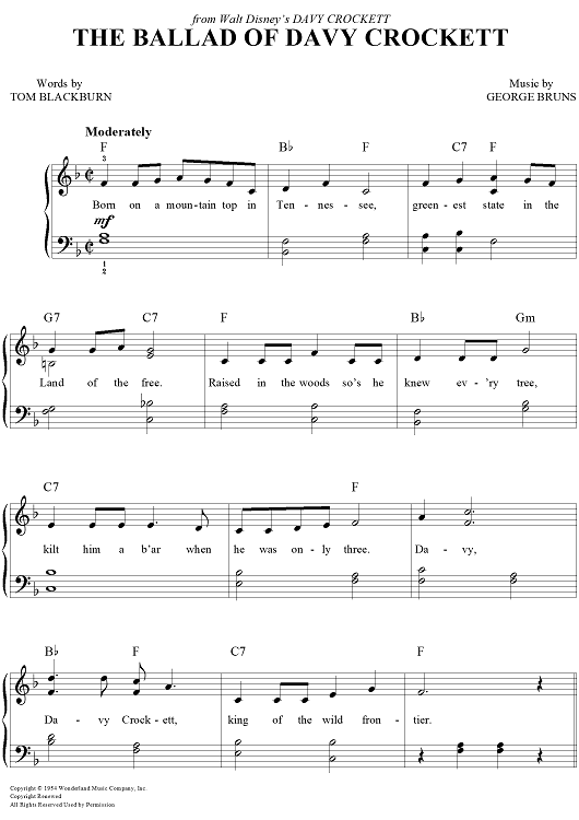 Digital Sheet Music for The Ballad Of Davy Crockett by Tom Blackburn, George Bruns scored for Easy Piano/Vocal/Chords; id:453235