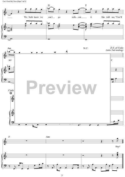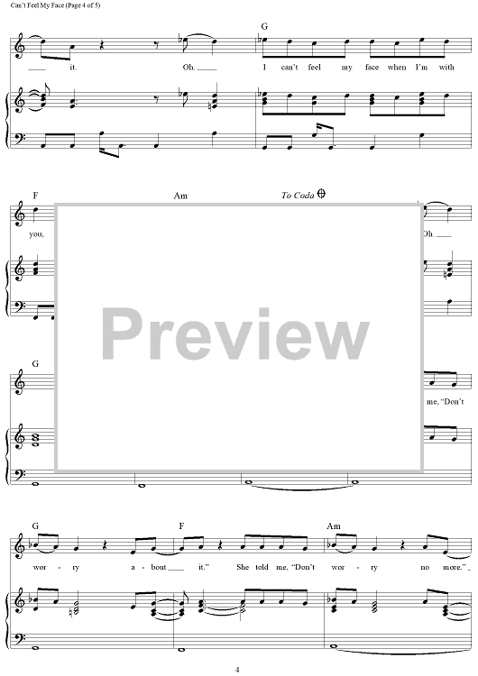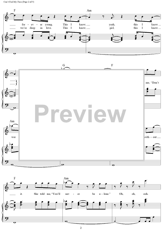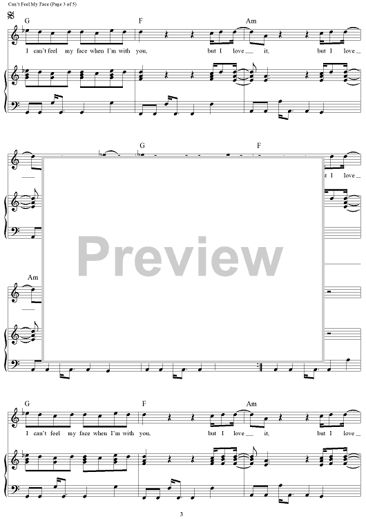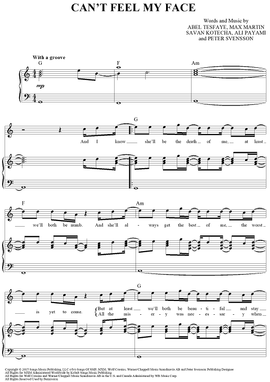 Digital Sheet Music for Can't Feel My Face by Max Martin, Peter Svensson, Savan Kotecha, Ali Payami, Abel Tesfaye, The Weeknd scored for Piano/Vocal/Chords; id:453254