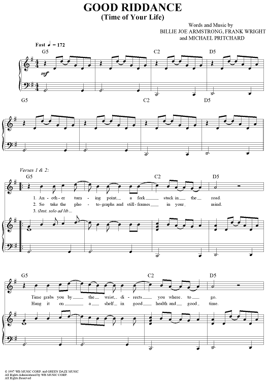 Digital Sheet Music for Good Riddance (Time of Your Life) by Billie Joe Armstrong, Frank Edwin Wright III, Michael Pritchard, Green Day scored for Piano/Vocal/Chords; id:119770