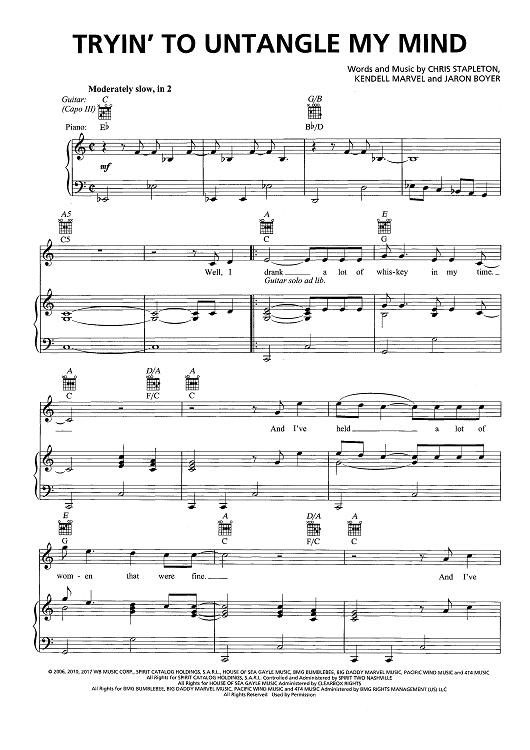 Digital Sheet Music for Tryin' To Untangle My Mind by Chris Stapleton, Jaron Boyer, Kendell Marvel scored for Piano/Vocal/Chords; id:466423