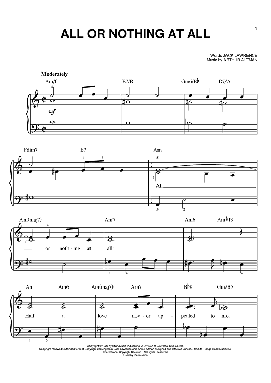 Digital Sheet Music for All Or Nothing At All by Frank Sinatra, Ella Fitzgerald, Arthur Altman, Jack Lawrence, Harry James scored for Easy Piano; id:375156