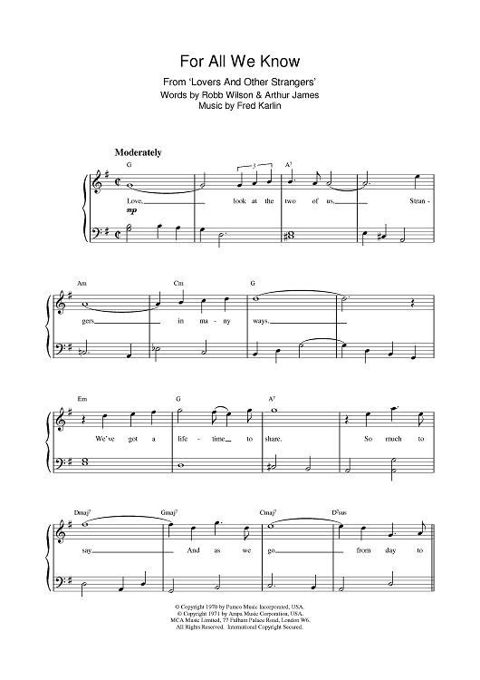 Digital Sheet Music for For All We Know by The Carpenters, Fred Karlin scored for Easy Piano/Vocal/Chords; id:378956