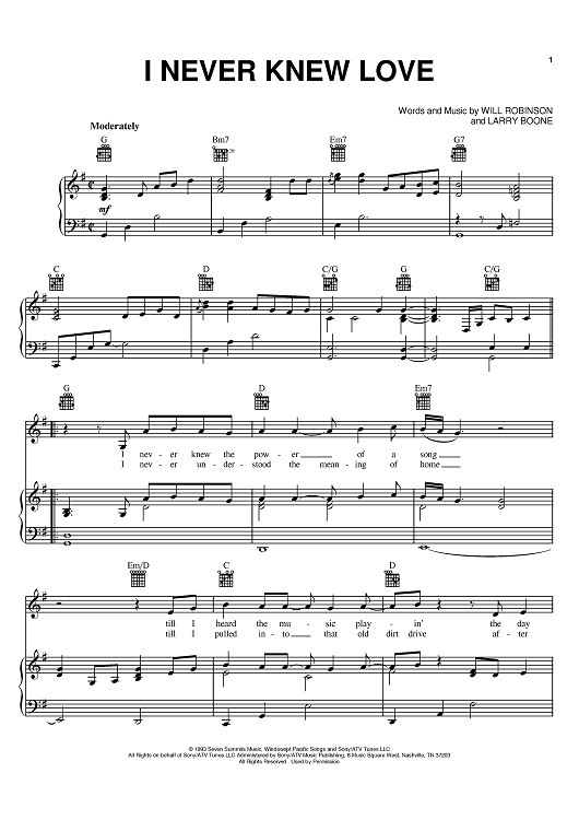 Digital Sheet Music for I Never Knew Love by Larry Boone, Doug Stone, Will Robinson scored for Piano/Vocal/Chords; id:368325