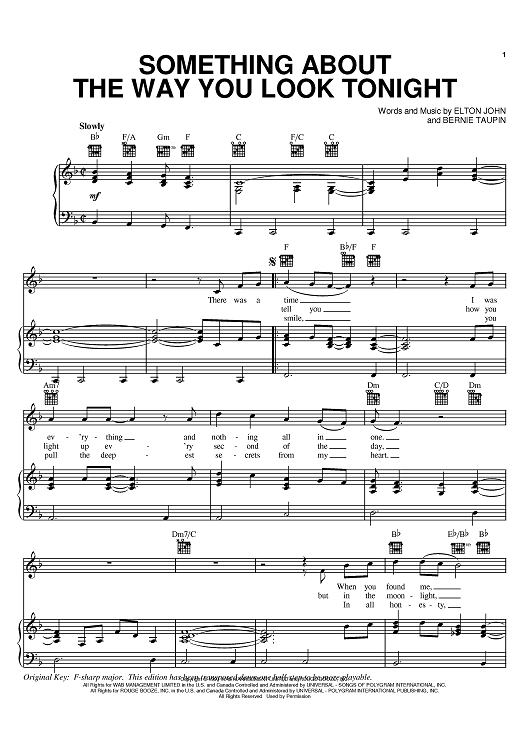 Digital Sheet Music for Something About The Way You Look Tonight by Elton John, Bernie Taupin scored for Piano/Vocal/Chords; id:368351
