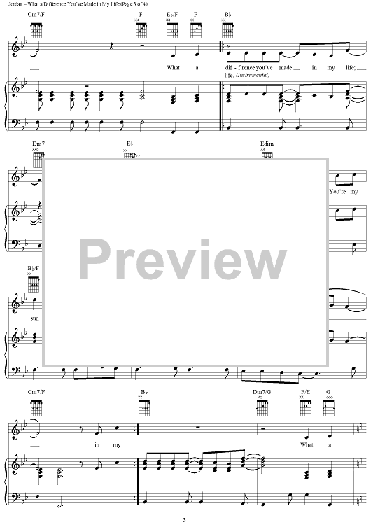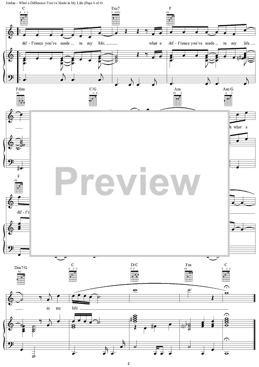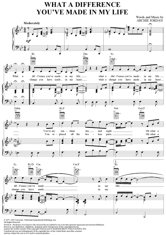 Digital Sheet Music for What a Difference You've Made in My Life by Archie Jordan scored for Piano/Vocal/Chords; id:287175
