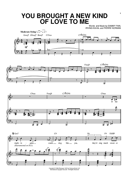 Digital Sheet Music for You Brought A New Kind Of Love To Me by Frank Sinatra, Sammy Fain, Irving Kahal, Pierre Norman scored for Piano/Vocal/Chords; id:390429