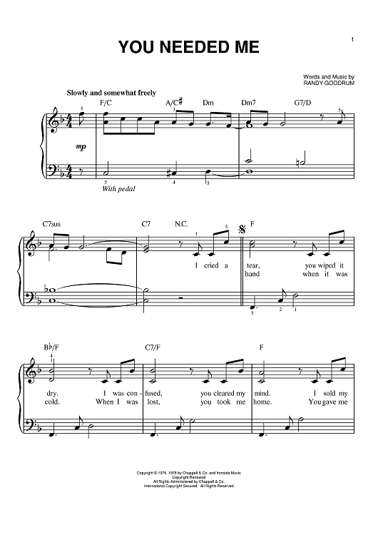Digital Sheet Music for You Needed Me by Tammy Wynette, Randy Goodrum, Anne Murray scored for Easy Piano; id:373962