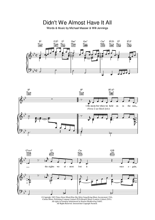 Digital Sheet Music for Didn't We Almost Have It All by Michael Masser, Will Jennings, Whitney Houston scored for Piano/Vocal/Chords; id:394223