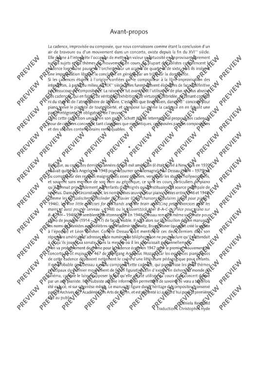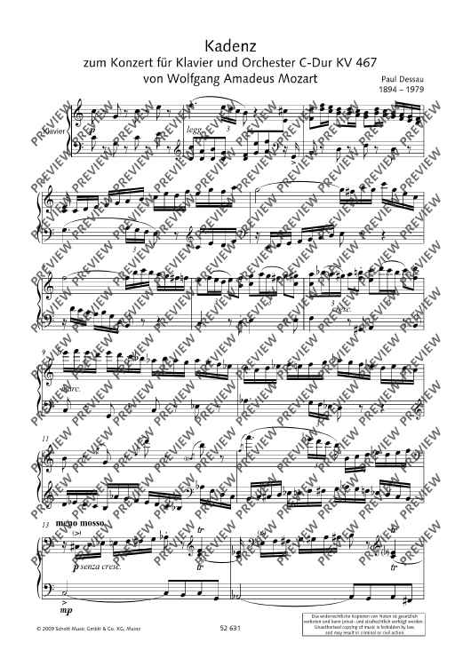 In our popular 'Cadenza' series, we present cadenzas of well-known instrumental concertos from the classical and romantic periods which were composed by outstanding composers and soloists of our time. The combination of historical music and contemporary additions results in extremely exciting musical moments. In our latest volume, we publish for the first time the cadenza written by Paul Dessau in 1947 on Mozart's Piano Concerto K 467. One may only speculate for which occasion it was composed by Dessau. Before returning to Germany from the USA in 1948, he had written numerous little piano pieces, most of them for piano lessons. In addition, he had rewritten his early piano sonata completely. In this context, he also noted down the names of pianists such as Vladimir Horowitz, Bruno Eisner and Leon Fleisher with whom he was in touch, hoping for the performance of the sonata. Perhaps the cadenza too was created in this hope. We do not know if it was ever performed. But now, all pianists are given the chance to play it!