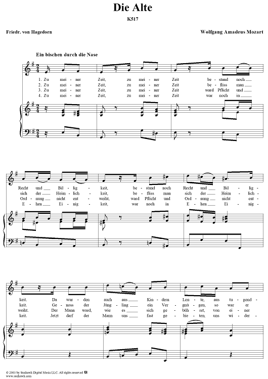 Digital Sheet Music for Die Alte: "Zu meiner Zeit", K517 by Wolfgang Amadeus Mozart, Friedrich von Hagedorn scored for Voice/Piano; id:291347