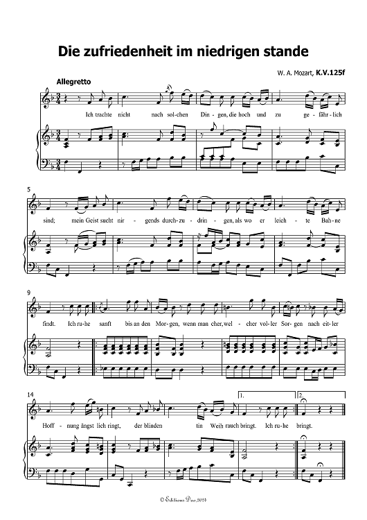 "Die zufriedenheit im niedrigen stande" K.V.125f, in F Major, for Voice and Piano