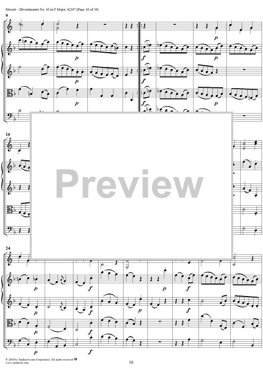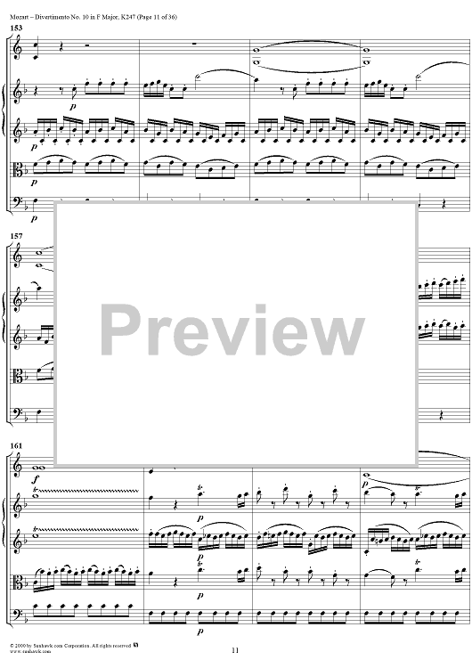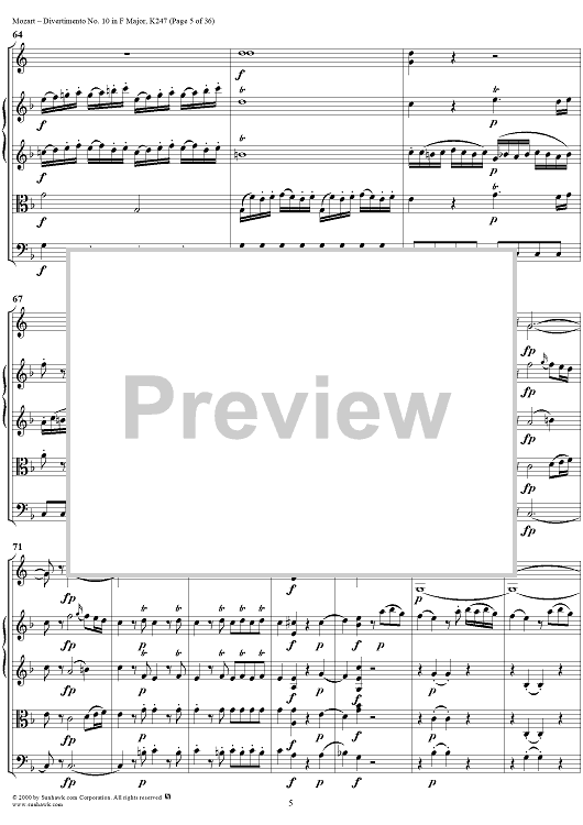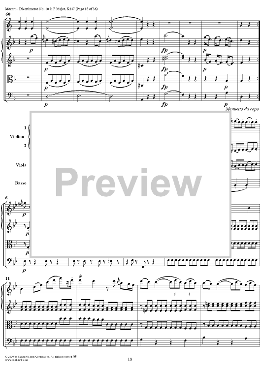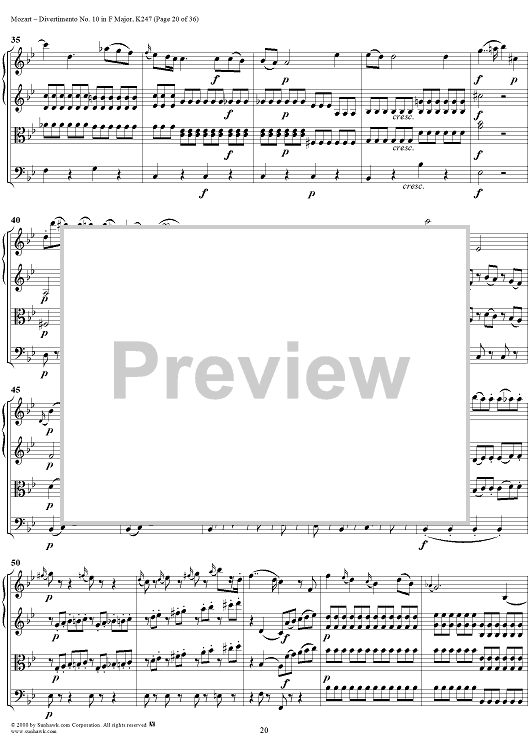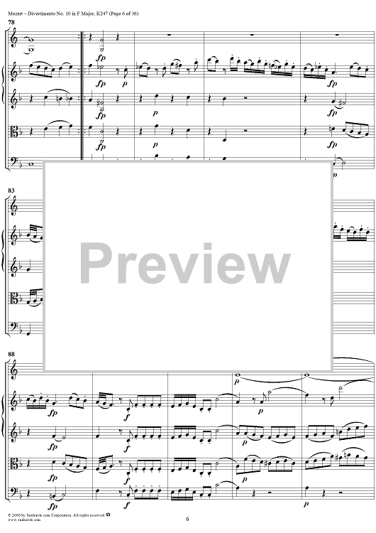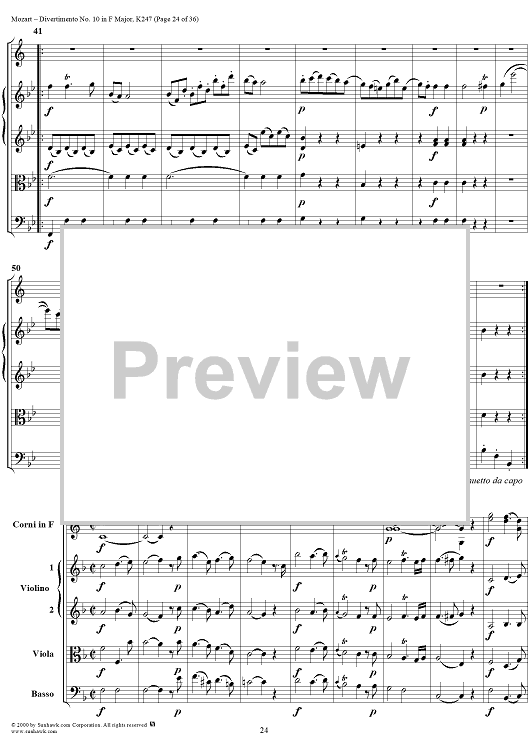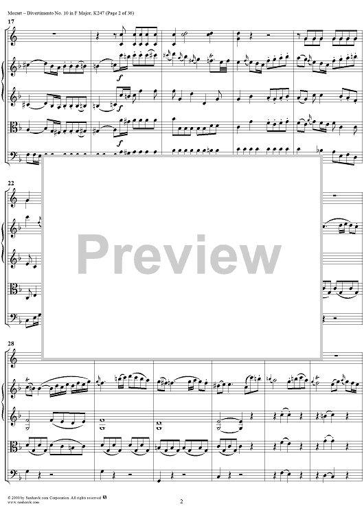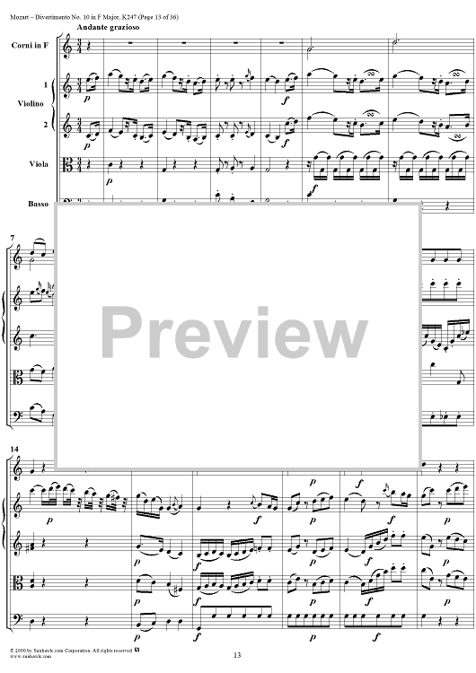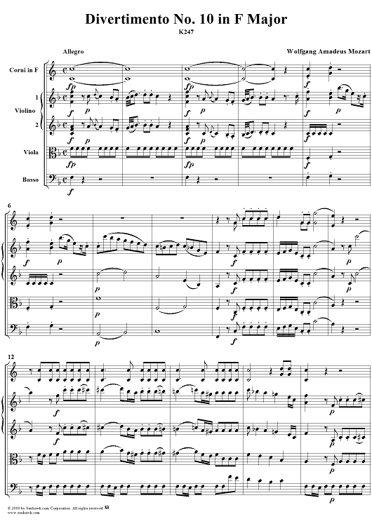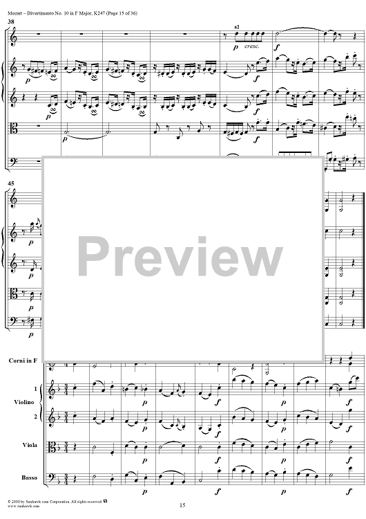 Digital Sheet Music for Divertimento No 10 in F Major, K247 - Full Score by Wolfgang Amadeus Mozart scored for Two Horns/Strings; id:264958