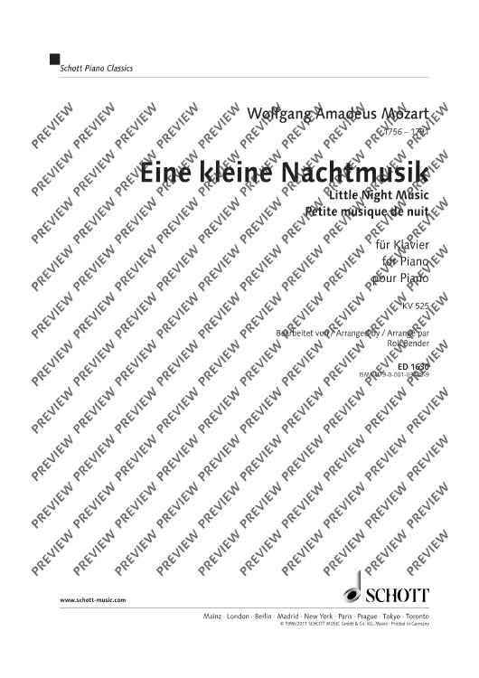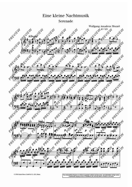 One of the most famous works by Wolfgang Amadeus Mozart and one the most popular classical works in general. Eine kleine Nachtmusik is simple but entertaining, exactly the effect the composer was looking for. This arrangement for piano captures Mozart's great sense of fun.