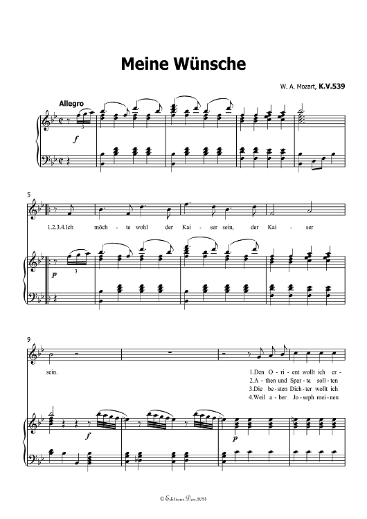 "Meine wunsche" K.V.539, in B flat Major, for Voice and Piano