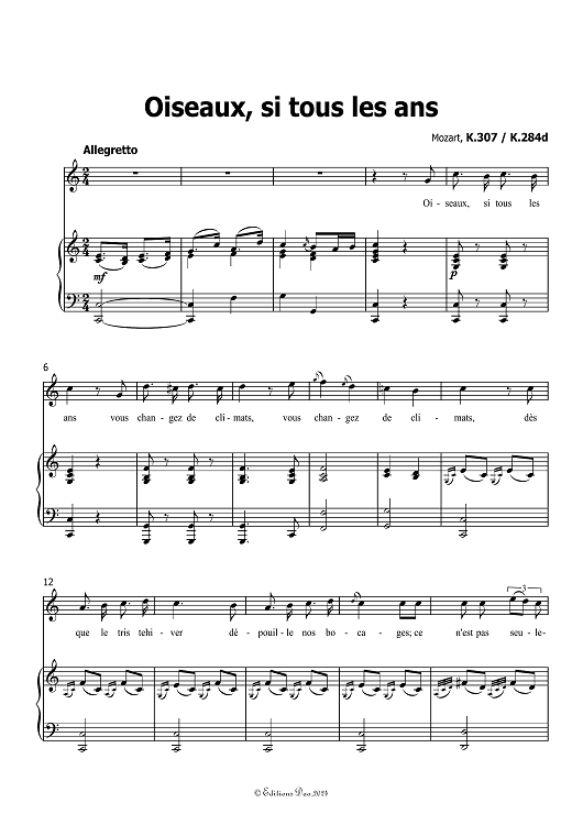 "Oiseaux,si tous les ans"K.307/K.284d , in C Major, for Voice and Piano