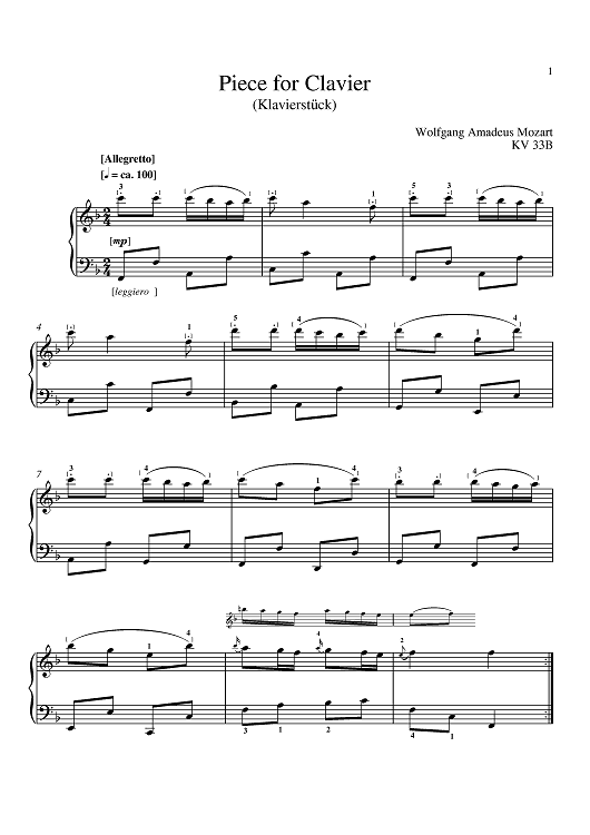 Digital Sheet Music for Piano Piece (Klavierstuck) by Wolfgang Amadeus Mozart scored for Piano; id:394854