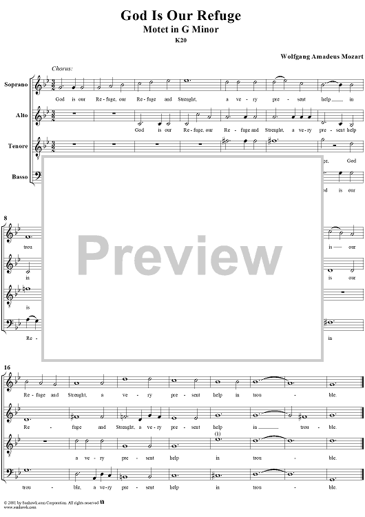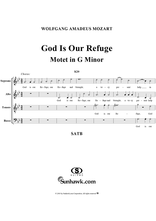 Digital Sheet Music for Spruch "God is Our Refuge" (Psalm 46:1), K20 by Wolfgang Amadeus Mozart scored for Four-part Mixed Chorus; id:262397