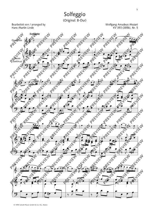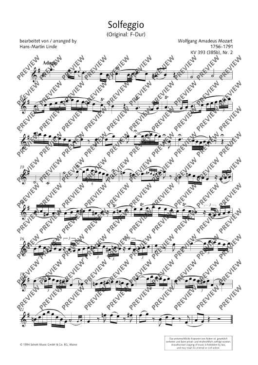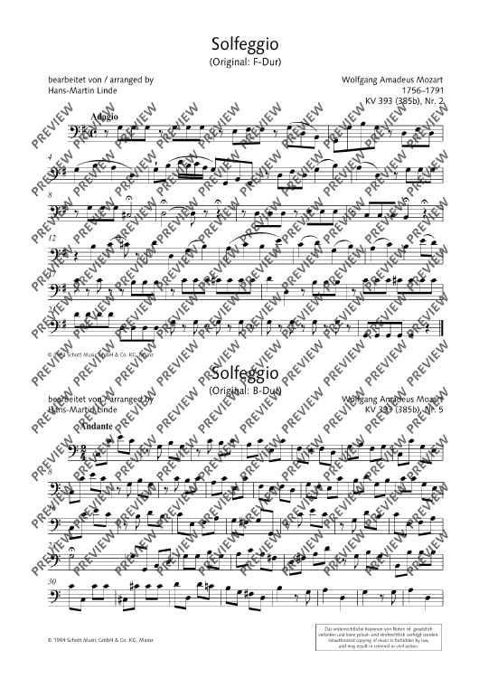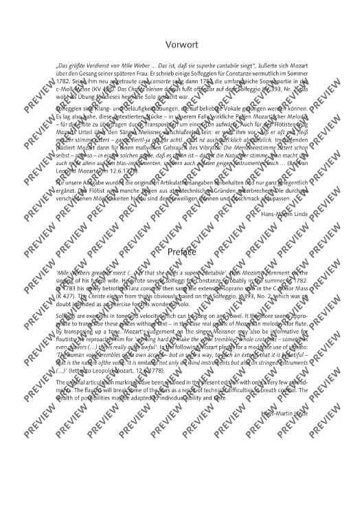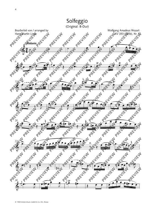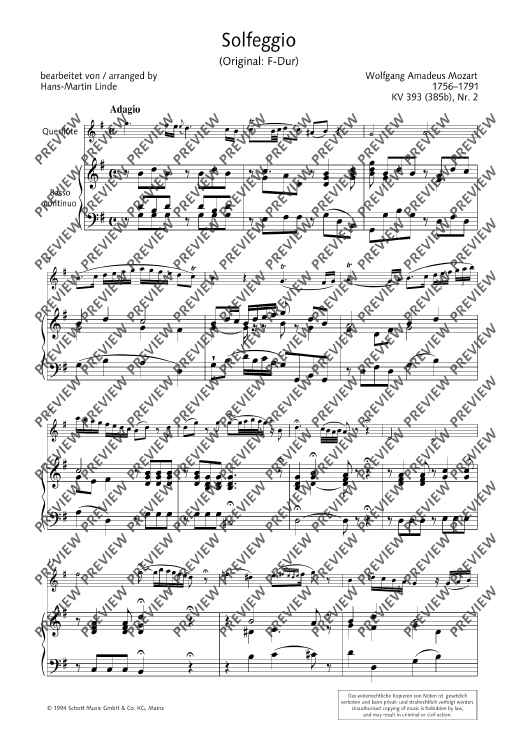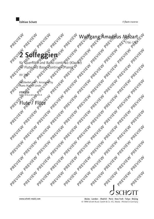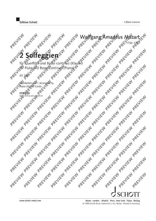 Sieht man einmal von den Konzerten ab, sind die Flötisten von Mozart nicht sehr verwöhnt worden. Daher hat Hans-Martin Linde die beiden Solfeggien (KV 393) für Flöte und Klavier (Basso continuo) bearbeitet und den Flötisten damit zwei dankbare kammermusikalische Stücke zur Verfügung gestellt. Mozart schrieb diese beiden Gesangsübungen im Sommer 1782 für seine Frau Constanze. Es lag nahe, diese untextierten Stücke - wirkliche Perlen Mozart’scher Melodik - für die Flöte zu übertragen, durch Transposition um einen Ton aufwärts.