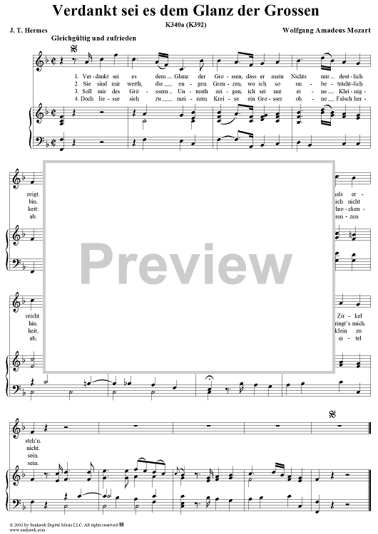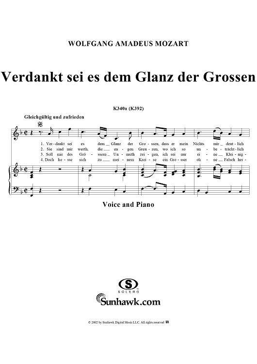 Digital Sheet Music for Verdankt sei es dem Glanz der Grossen, K340a (K392) by Wolfgang Amadeus Mozart, J. T. Hermes scored for Voice/Piano; id:291303