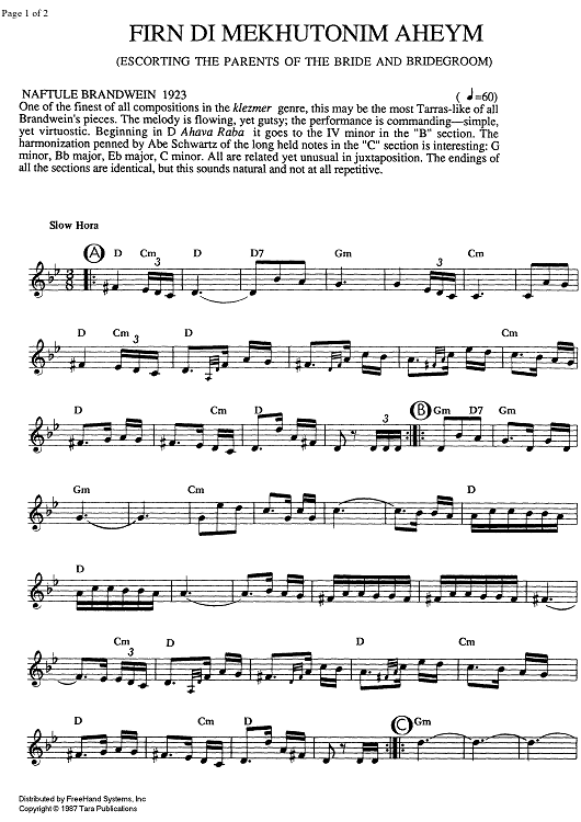Digital Sheet Music for Firn de mekhutonim aheym (Escorting the Parents of the Bride and Groom) by , Traditional scored for Any Klezmer instrumentation; id:337949