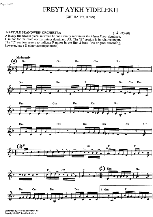 Digital Sheet Music for Fryt a ykh yidelekh (Get happy, Jews) by , Traditional scored for Any Klezmer instrumentation; id:337961