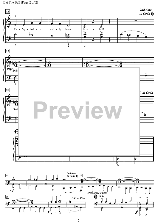 This solo is perfect for young fans of baseball! The melody, written in Melody C position, is divided between the hands. Features of the piece include 4/4 meter, root position chords, staccatos, and accents. A few accidentals are used as well. Lyrics add to the excitement of the piece, and an optional duet accompaniment fills in the harmonies.