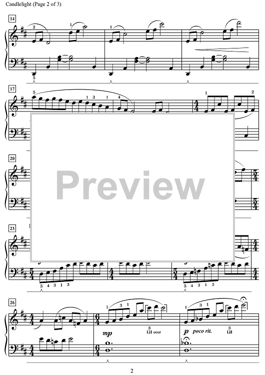 You'll see beautiful candlelight dancing across the room as you play this intermediate solo. In the key of D major, this piece contains cascading lines that move up and down the keyboard and form an enchanting melody. Combining the use of pedal with these flowing lines will create a challenge that offers great rewards when perfected.
