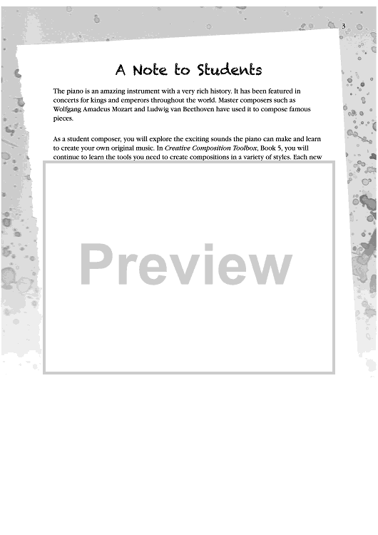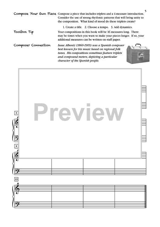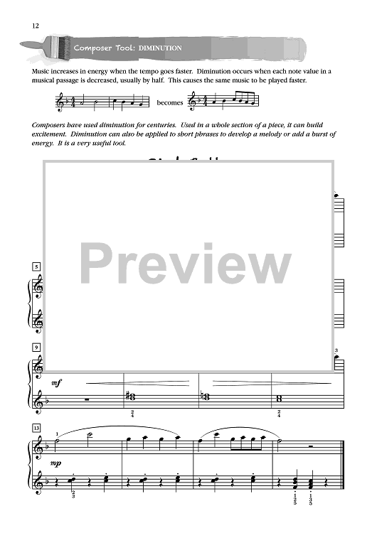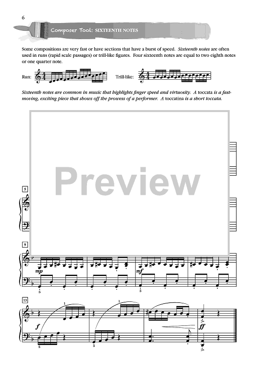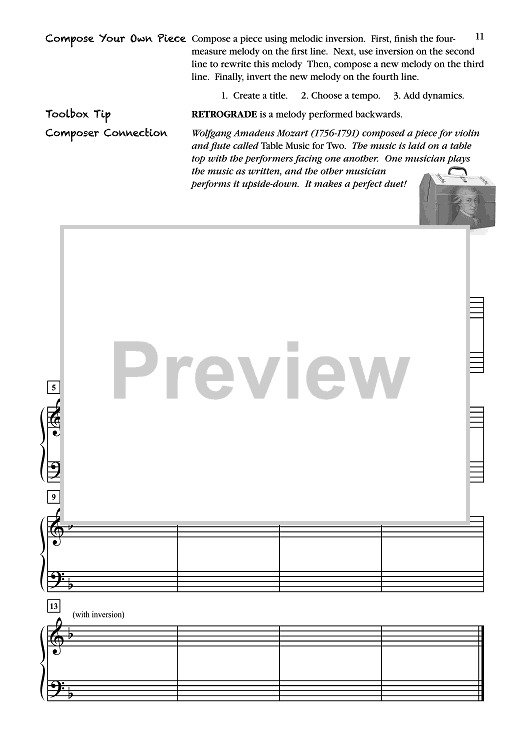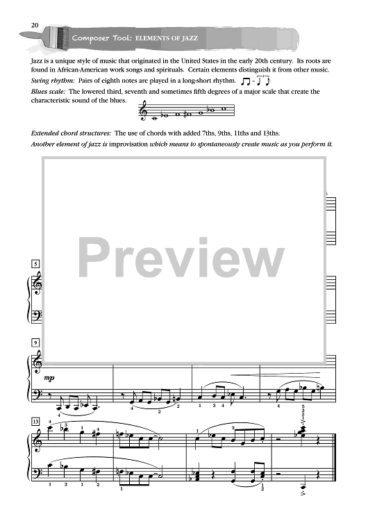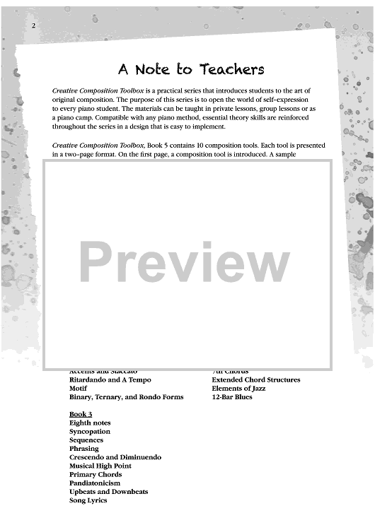 This intermediate book introduces students to the art of original composition. It features the following composition tools: triplets, sixteenth notes, retrograde, inversion, diminution, augmentation, 7th chords, extended chord structures, elements of jazz, and 12-bar blues.